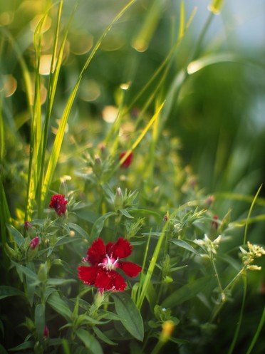 - Green and red, both colors which can be found on the complementary sides of the color wheel, work well together in this lovely image. The sun light highlighting some of the fine grass in a superior way. The narrow depth of field is chosen wisely for this capture. It underlines the foreground, the little red flower.