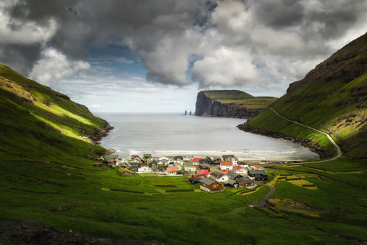 - One really gets a good cozy feeling for what life might be like in this little seaside community by looking at this image. The placement of the village in the bottom center of the composition, where it is surrounded by the green hills and blanketed by clouds, helps impart a very stable and secure feel. Excellent timing to catch the light as it comes through the part in the clouds onto the buildings. Nice!