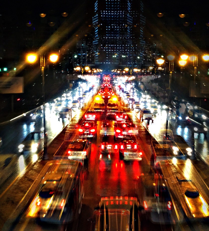 - We like how this beautifully colored image conveys the movement of the flowing traffic but yet has a calm feel to it – perhaps because the primary shape of the red lights is a triangle with the base on the bottom center of the image.
