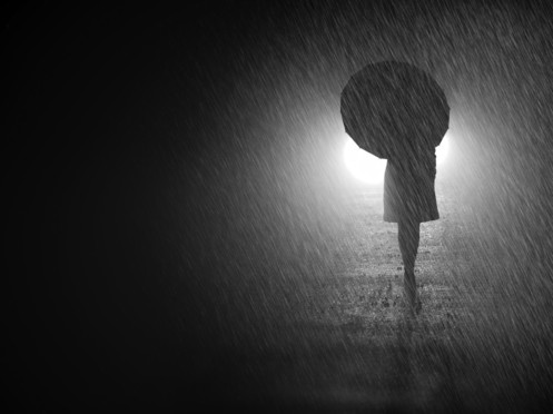 - A simple but effective shot. A dark rainy night, bright head lights and the silhouette give this photo atmosphere and intrigue.
