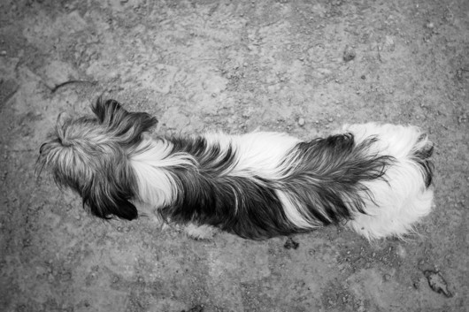 - What a fabulous image of symmetry and simplicity. I might suggest a slightly tighter crop, just enough to crop out the trees on the right, and straighten so that the architecture at the top of the frame is a little more level. In fact, cropping out the wooden framework at the top - resulting in a more panoramic format - gives this image an even stronger impact, allowing the viewer to focus on just the dog and the pillars and sweeping vine. Nicely done! ~ illona
