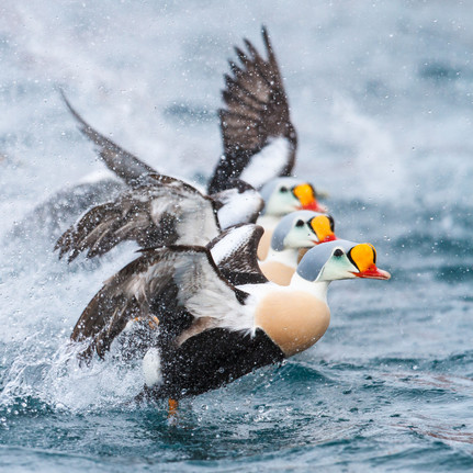 - The tight formation and 'stacked' effect of these stunning King Eiders provide a strong action composition.