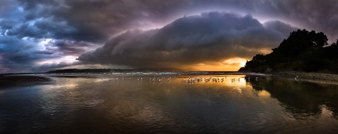- Maxime Sacré. I took this picture on the Mahia Peninsula, in New Zealand. Just before the sun went down, a huge cloud started to rise from the horizon, bringing amazing colors to the scene. A few minutes later, an extremely strong wind started to blow while the gulls stayed there, facing the light. Photo taken with my Canon 500D. Post processing done with Adobe Lightroom 5, after I've stitched 8 photos on Adobe Photohop CS6. You can watch this picture on my website or my facebook page (https://www.facebook.com/maximesacrephotography).