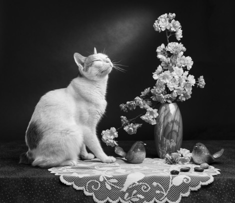 - This "still-life with cat" is simply sweet because of the cat's expression. Wonderful capture and expert management in conversion to black-and-white. Nicely done. ~ illona