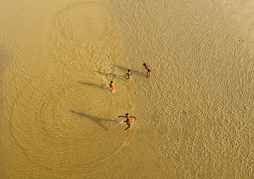 - Title: JOY OF LIBERATION, Location: West Bengal, India. Camera: Nikon D5100, Nikon 18-105mm Lens. Post Processing: Adobe Photoshop Description: The children of the village in the vicinity are leaving their foot-prints on the Matla river bed at west Bengal, India. They are the wards of poor fishermen and struggle for their livelihood from morning to night. School-going is a far-off wish to them. These children help the guardian's bearing nets, rowing boats, catching fishes and even to make reach the collections to the fish-depot. But their JOY knows no bound when they are free of work. Through my lens i have tried to depict the boundless JOY of their abysmal Happiness.