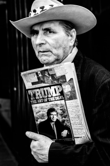 - Relevant for our times, a man with his support material for Trump, or perhaps material to study to learn more about the then candidate. You wonder what the story is, and that’s what is interesting.