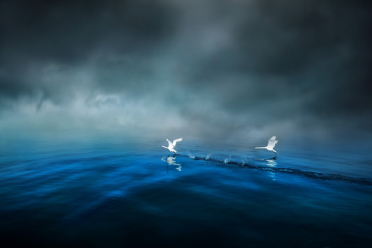 - The serene bottom half and sinister top half of this image combine to create an eerie setting for these flying swans.