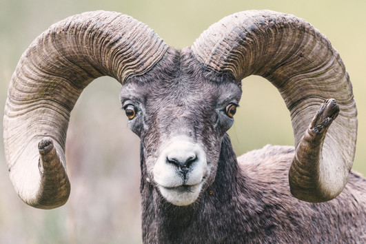 - This is a strong and simple image. It is a fun and clever long lens portrait, showing off this big horned sheep’s rather extra-terrestrial, wide-eyed glare between those magnificent horns. Well done.