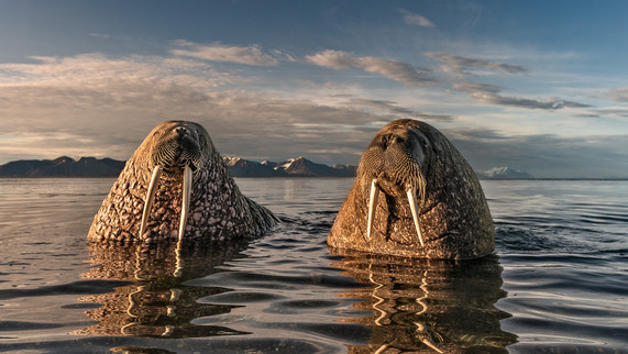 - Thank you very much for choosing my picture as the First Prize! I am a nature and wildlife photographer in Florence, Italy. This photograph was taken in Svalbard Islands, on a summer night at around midnight. In this region walruses have been near to extinction because of hunting till 1952, when they were protected by law. Since then their number has progressively increased and nowadays they are relatively common. These two males belong to a small group of about 20 individuals. The photo was shot with a Nikon D800E and Zeiss 21mm f2.8 lens, entering into the cold sea water to obtain a picture of the animals in their environment.