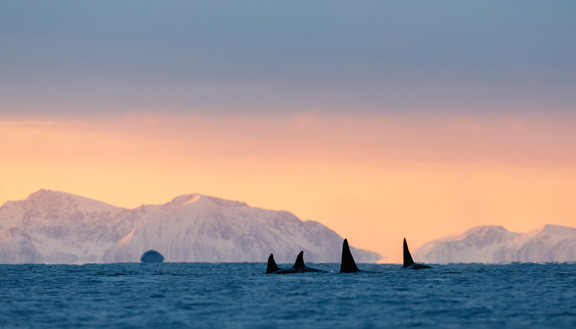 - This is an original zoomed photograph of orca fins in a cold blue Arctic sea. Looks like a happy family out for the day. Nice chilling atmosphere, i hope your boat was rigid.