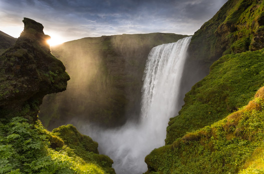 - Thank you for this mark of excellence. It was a treat to experience Skogafoss under such magical lighting conditions. I tried to bring this element out in the image. First I had to wait for the setting sun to break through the clouds. This beautifully backlit the mist from the waterfall, and brought out the semblance of a face in the rock feature to the left. This is a composite of three images, shot handheld, and manually blended in Lightroom. It was taken on a Canon EOS 6D with a Canon EF 17-40mm f/4 L lens. Thanks again, and congratulations to the winner.