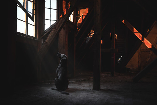 - Oh my, this image is simply stunning with its play of light against the deep shadows. The variety of textures from the old wood, the dusty, littered floor, and the warm rays of light flooding through the window keep the viewer's eye traveling through the photo but always ending on the sweet dog. Wonderfully seen and captured. An instant fave! ~ illona
