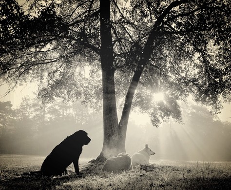- This is such a beautiful and powerful image. It appears as though the dogs are all seniors, enjoying a morning gathering. The wonderful sun rays, the contrast of the three dogs, the breath from the middle dog hanging in the air ... all these details bring the viewer back again and again to be a part of this peaceful moment. Nicely done. ~ illona