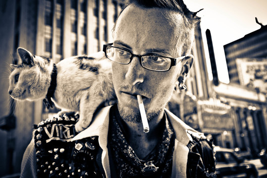 - Howdy! Thank you very much for selecting my photo, and I am honored! My name is Kelly O'Brien and I am an Austin, Texas native living in Los Angeles. This photo was shot with a Nikon D7000 and edited with Adobe Lightroom. I happened to be walking to an event near Hollywood Blvd, when I spotted this interesting character. More so, he had a cat on his shoulder! I had my camera on me, and really wanted to take his photo, but I didn't know how he would react. He approached me and asked me for a cigarette, and I saw this as a good opportunity and seized it -- told him I would give him one in exchange for allowing me to take photos of him. Told him not to pose or look at the camera, and got a few shots! It was a great moment of spontaniety, and I post-processed it in such a way to add more grit and grunge to the photo to reflect the personality and beingness of the subject.