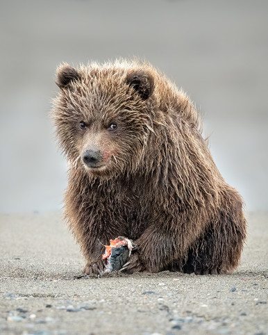 - This photograph says so much, and it is fun. There is the “It is mine and you won’t get it!†but it is also so wild; the ripped up bit of salmon flesh, the outdoor-wind-swept fur coat and bloody muzzle. It is a great telephoto photo with a sharp short focus isolating this young bear.