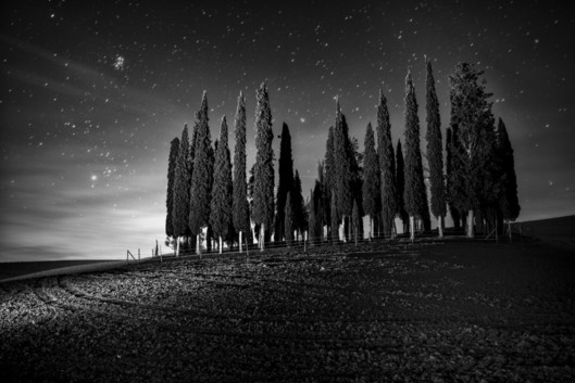 - I taken this shot in a cold winter evening some weeks ago, I was working at some projects when on the road back home I saw these trees and I realized the sky was really full of stars! I used my trusty Leica Monochrom with my summilux-M 28mm f/1,4, if I remember at f/1,7 50 sec. iso 1600! This Place is magic, you can find it in Tuscany near San Quirico D'Orcia. Thank's a lot for voting it!