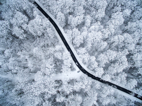- The graphic frame and an unusual viewpoint bring interest to this drone shot where the black asphalt contrasts so well with the snowy forest.