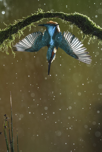 - With so many diving Kingfisher images around these days, it's hard to find a different 'take' on this subject. This image achieves it by a combination of backlighting, raindrops and the timing to capture the instant of launch. The arched pose and perch make for a strong, dynamic composition.