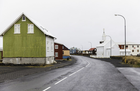 - While seemingly simple, almost bland, this image continues to hold the viewer’s attention. It’s quite brilliant, really, for its use of line and shape compositionally. The dotted line in the middle of the road is repeated in the street lights, the window at the top of the green house also repeats in the church, and the windows themselves sort of pick up the dashed lines too.