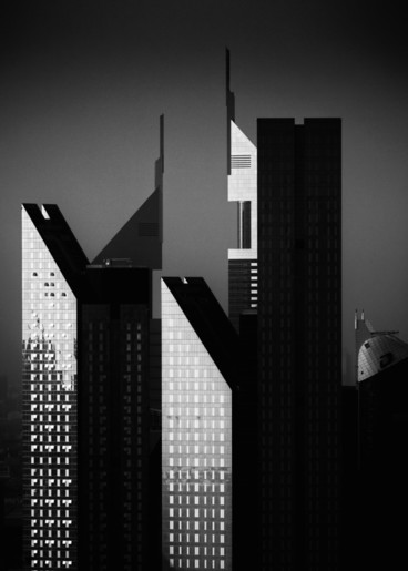 - Reduction of tones to leave mostly white or mostly black works well in this image because that helps separate out the unique shapes of the buildings. These shapes play together lyrically in the composition. Wonderful!