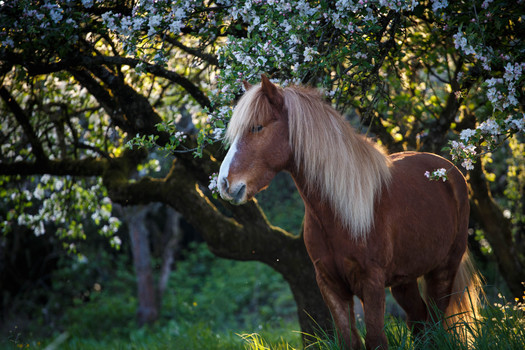 - This image is rich in texture, tones and light ... a beautiful setting and a peaceful overall feel. The branch of blossoms in the foreground works wonderfully to place the horse into this intimate setting. Nicely captured. ~ illona