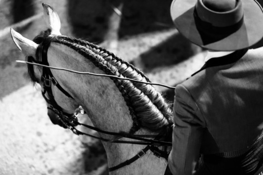 - The strong black-and-white conversion along with the unusual angle make this image truly stand out. The variety of textures - the fabulously braided mane, the soft ears, the speckled hide, leather reins, stick and fabric of the rider's jacket -- all work together invite us to see more upon each viewing of this fabulous image. Nicely done! ~ illona