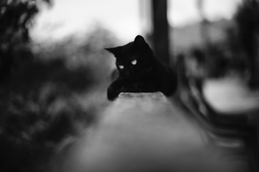 - This is such a fabulous image and an instant favorite. The shallow depth-of-field gives the background such a soft, almost sweeping feel, along with the receding line of the rail, tunnels our vision immediately to this incredible cat. I think that a little definition in the cat - just a hint of his nose - might make it even stronger, so that he doesn't look like a black hole with eyes. But otherwise, this is a tremendous image with great vision and execution. Bravo! ~ illona