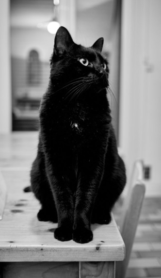 - The almost abstract nature of this photo makes it immediately compelling ... the stark backdrop, accentuated with the dark, geometric shape of the wall, balances out the composition of this this photo with the black cat. Wonderfully seen, captured, and managed in post. ~ illona