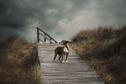 - Oh, but how I do love this image ... the receding line of the boardwalk, and the angle of the railing in the background ... all leading to this great dog bracing himself against the wind. The post work on this image is fabulous ... wonderful tones and a dramatic sky. Beautifully seen, captured and managed in post. ~ illona