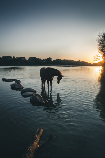 - This is a lovely almost-silhouette image ... beautiful tones and light, and the strong line of the horse's neck draw us in to his reflection in the rippled water. I do find the log in the foreground to be somewhat distracting and wonder if the image might be stronger without it. But a beautiful image nonetheless! ~ illona