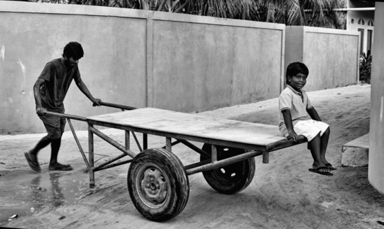 - Sometimes the best and most creative games among kids is simplicity. It doesn’t take a lot for children to have fun. This photo illustrates this well, the boys look happy and content with their big ’toy’. We like the straight lines in the photo, mixed with diagonals and round tires. The kids break up the symmetry. Well composed and seen.