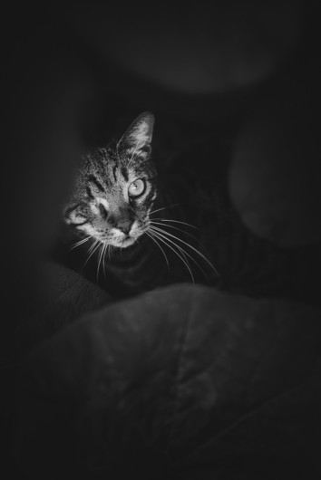 - This amazing image was an immediate favorite, and - truly - the top three images of this month's Cat Competition made it difficult to choose the ultimate 'winner' ... they are all so strong and so captivating. The depth achieved in the deep blacks and the contrast with the brighter whites, firmly frame this feline, capturing the viewer's eye with both the contrast and the variance in texture, from the soft foliage to the sharp focus on this gorgeous cat's face and whiskers. Wonderful capture, framing and editing. Congrats! ~ illona