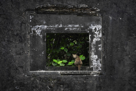 - This is such an intriguing, simple image that is complex at the same time. The viewer is almost caught up in an Escher-like moment, wondering how the layers work. The mono-tonal layered walls, leading us to the brilliant blast of bright greens, draw us in to this cat's direct stare ... so perfectly framed in the opening, and in the frame of the photo. Nicely done! ~ illona