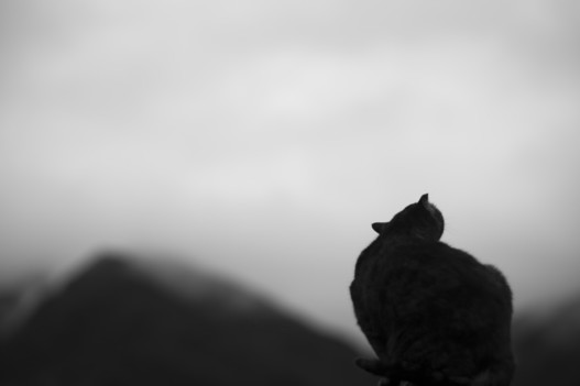 - This is such a simple yet strong image. The framing of the cat in the "V" of the two distance mountains (?) and the strong right-hand framing allow the viewer's eye to firmly land on this cat. I do find that the crop at the bottom is a bit tight, and wonder about seeing a little more of what the cat is sitting on. But otherwise, this is a wonderful image. ~ illona