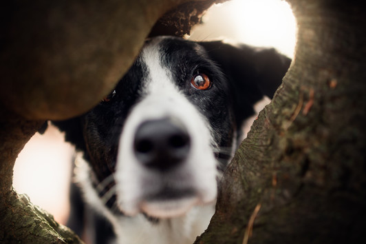 - This is a fabulous image. With his intense gaze partially concealed by the old log/tree, this collie's eyes draw us into this intimate closeup. The varying textures from the bright eye, to the collie's fur, the rough bark to the soft sun flare at the top, all work to make this a rich yet simple image. Nicely set up, captured and managed in post. ~ illona