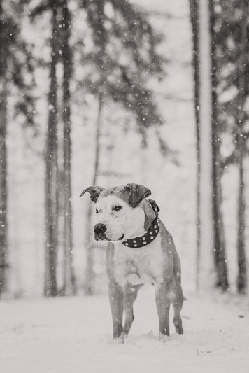 - This is a lovely and wintry photo ... the falling snow and the dog's calm gaze giving the overall image a peaceful quality. Nicely captured. ~ illona