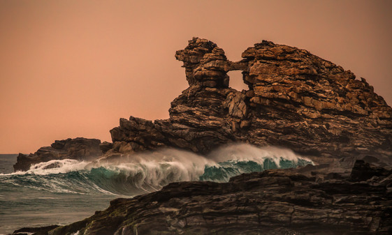- Although this composition may at first seem cluttered with overlapping subject matter, it is exactly that which creates the impression of peeping over the rocks to see the waves. The rock formation is striking, the crashing wave completes the image.