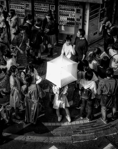 - A clever frame where the boy and his father are set apart from the young crowd with the help of the very central, white umbrella. We then wander through the image, most effective, well done.
