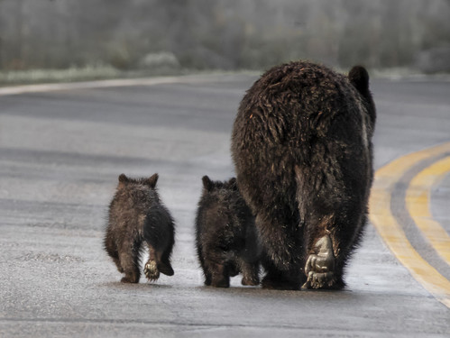 - Angela Poggioni - "On the Road" -This photo was taken in West Yellowstone, Montana, United States. As I was in the car exploring the area, a female Bear with two cubs came down to the road from the forest. I started to follow the adorable family on foot. After almost two hours finally Mother Bear found an entrance in the forest. Luckily no cars came from the opposite direction and the family made it safely into the woods. This unfortunately is not uncommon. Several bears over the years have not been as lucky. I used Nikon D500.