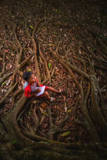 - Without seeing the tree, the roots give away that it has to be majestic. Having this young boy sitting on those roots underlines the scale of this tree even further. The warm colours of brown and red tones work very well. Having this boy captured from above is a great way of presenting this situation.