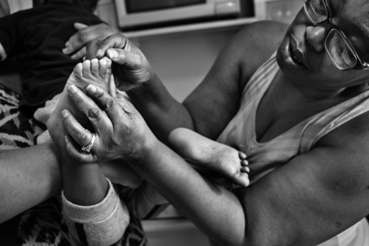 - This black and white photo is exceptionally framed and executed. The emotions of how the motherly hands are touching the child's little foot gently, is shown in a magical way. All the different angles in this image show great dynamic.