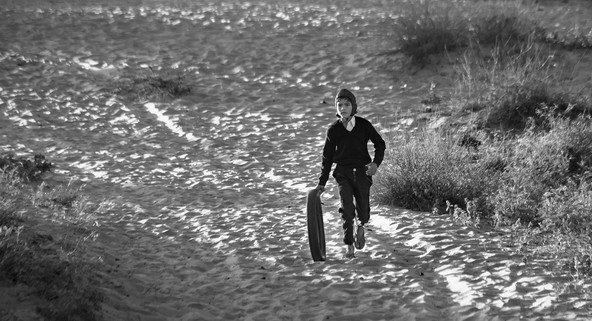 - Following a track, running up the hill with a tire in his hand. This boy is on a mission and seems to be devoted getting there. This is a lovely frame of a fine young man, beautifully executed in black and white. Having a lot of space around this person makes the mind wonder far.