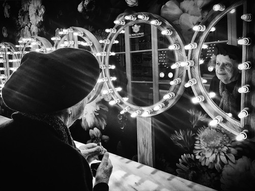 - Beautiful photograph with a lot of well-organized details and our focus goes straight to the lady in the mirror.