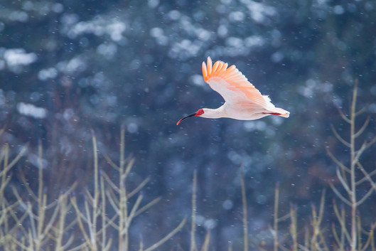 - An ibis flight shot made more interesting by the raindrops and environmental background