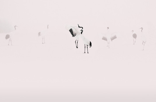 - An artistic arrangement featuring a centrally-placed pair of courting cranes flanked by faded birds in a variety of poses. The restricted (monochrome) palette and high key treatment add to the aesthetic, as does the alignment of the birds in the upper half of the frame with the outer birds looking inward. Overall, an interesting composition that stands out from the usual images of this species.