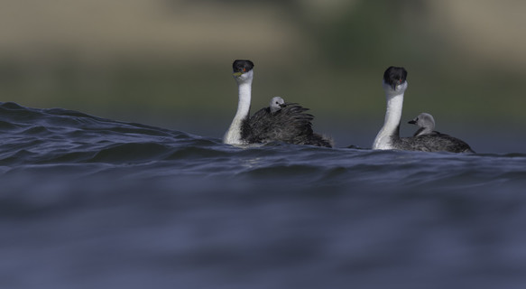 - Interesting combination of a pair of grebes looking at the camera while their onboard chicks exchange glances with each other