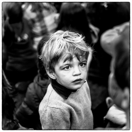 - This is a terrific capture with superb expression and light of this fine young man, underlined by a feeling of a black and white movie from some time ago, possible the 60th. This child is surrounded by many other people, and still - the photographer managed well, isolating him from the crowd - creating a story, which draws the observer to the center with the boy.