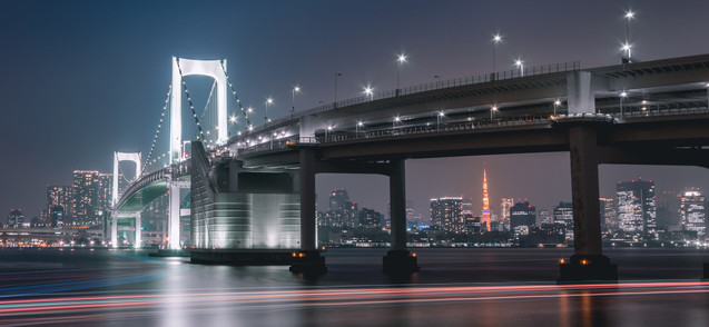 - Here is a well executed nighttime longexposure of Rainbow bridge with Tokyo shining out of the background. Velvety soft with lovely colours, well done.