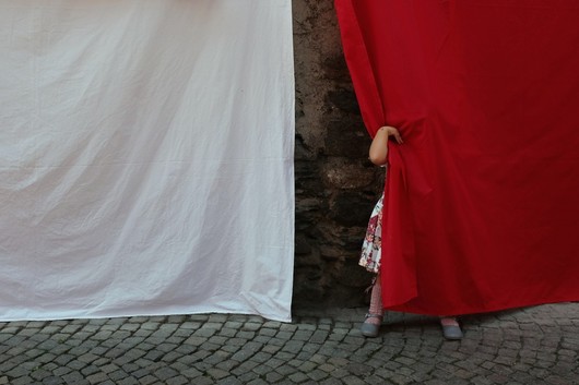 - We barely can see this little person, mostly being hidden behind this red curtain. But we do see just enough to identify that this is a young girl, being dressed beautifully wearing lovely shoes. This photo shows great composition and makes us curious to meet this young lady.