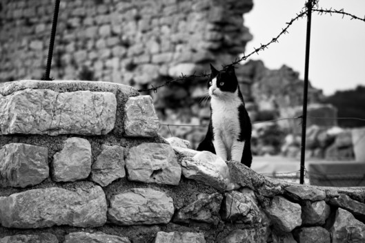 - This is a lovely capture of this cat ... the viewer can almost feel its calm presence, and the variety of textures in the stones, mortar, barbed wire fence, and the cat itself, keeps the viewer's eye moving throughout. Nicely done. ~ illona